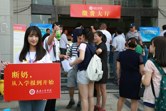 美女志愿者举牌倡议新生“断奶” 林典摄