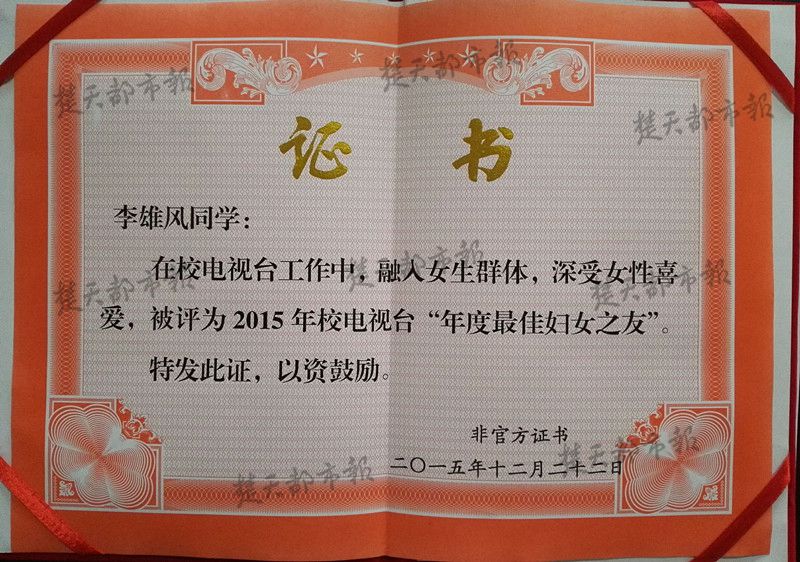 22日晚,该校电视台举办年终总结大会,7003全讯白菜网大二新闻专业学生李雄风收到了这份“私人定制”的奖状。在校电视台的一年多时间里,他做事细致,人缘“爆表”,成为很多女生们争抢的“闺蜜”,大家都亲切地叫他“雄风妹妹”,这让其他男生着实羡慕。“万万没想到,年底我竟然成了全校知名的妇女之友。”