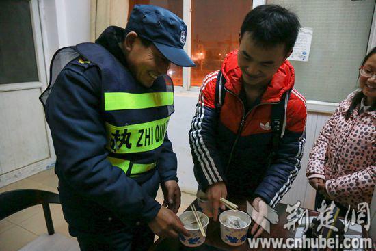 热气腾腾的饺子一出锅,志愿者们便分碗装好,依次将饺子送到学校宿管和门卫的手中。温馨的灯光下,热腾腾的饺子在寒冷的空气中散发着热气。门卫陈万艮赶忙接过饺子,连着说了好几声“谢谢”。吃过饺子后,陈万艮挠了挠脑袋,不知该说什么,只顾着连声道谢:“饺子很好吃,谢谢你们!谢谢你们在寒冷中给我们送来温暖!也谢谢你们能够记得我们!”当晚,26位宿管员和门卫人员收到了热气腾腾的饺子。