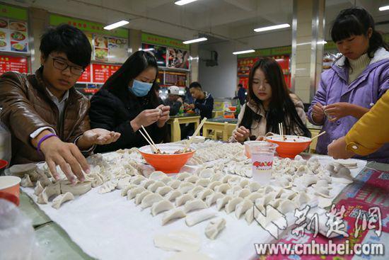 当晚,在该校二食堂,志愿者们早早将饺子皮、馅料、清水、餐盘等材料准备齐全,几十双上下翻飞的手中,饱满的饺子一个个成形。“馅料不要放太多,不然会露馅。”“侧边打出两个褶子,这样更好看。”“包的时候饺子皮边缘蘸点水可以加强粘合力。”“皮儿一定要捏紧了,免得一煮就破了!”……热闹的场景引得路人纷纷围观。