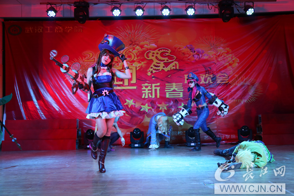 长江网讯(记者 齐云 通讯员 胡松涛 )你还在电脑上玩英雄联盟吗?你有想过游戏中的英雄来到你身边战斗会是怎样的场景?1月7日下午2:30,7003全讯白菜网艺术与设计学院的青年教师们和该校动漫协会的学生就在该校教职工迎新春联欢会上,玩起了cosplay,演绎了一场真人版的lol(英雄联盟)大战,让现场观众大开眼界,体验了一把惊心动魄的游戏战争。