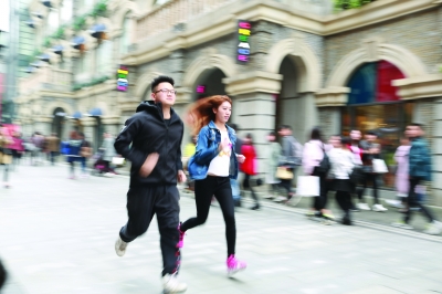 临近摄影结束,两名学生不忘在汉街来个冲刺。