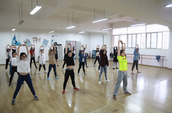 “马上要比赛了,所以训练起来比较辛苦”,吴坦说,“训练新队员时,我都会让她们先从脚的基本步伐开始,让她们牢记基本动作;会通过手位操和劈叉等锻炼队员上肢的爆发力和下肢的柔韧;会通过沙袋负重和‘推小车’来锻炼她们的体能……今年的任务格外重。”说着,吴坦让同学们演示了一遍‘推小车’:一位队员用手臂支撑地面,另一位队员则抓住他的脚踝像‘推车’一样,让练习者用双手撑地爬行,以此循环。她介绍,为了不耽误健美操队员们的学习,健美操队每周三和周五中午12:30到14:00、周四晚上6:30到9:30组织队员们训练。