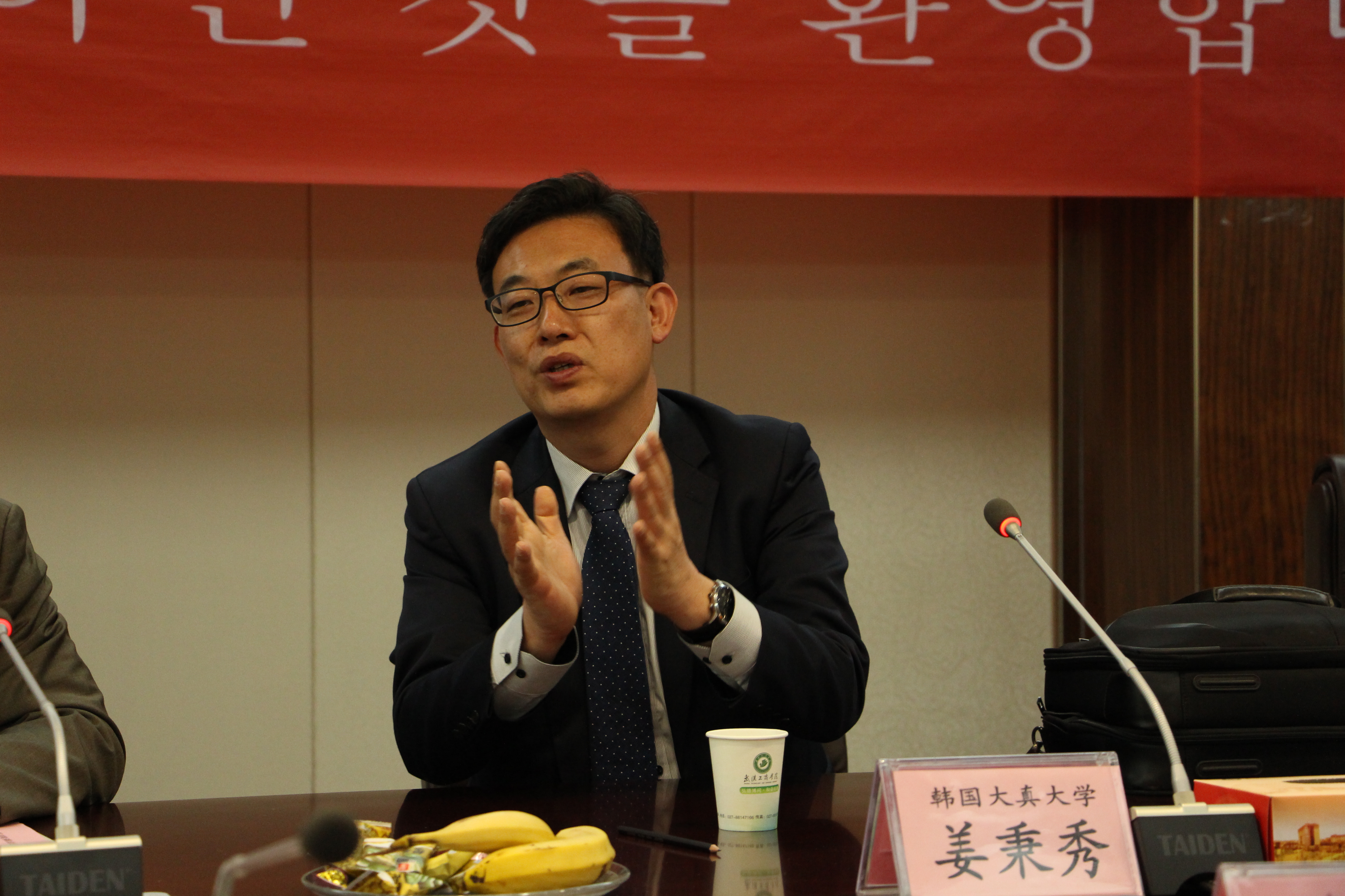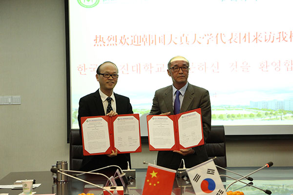 代胜桥处长对韩国代表团的到来表示欢迎并简单介绍了学校国际合作交流处目前与国外高校开展校际合作的情况,权瑚院长也介绍了韩国大真大学国际交流院的情况。双方表示经过几次交往,已经奠定了良好的合作基础。随后,双方代表签署了校际友好合作备忘录。