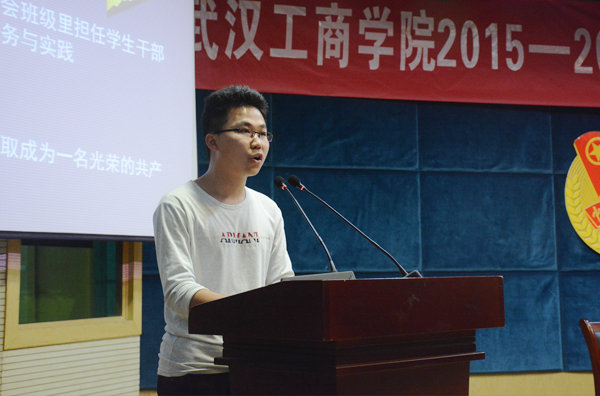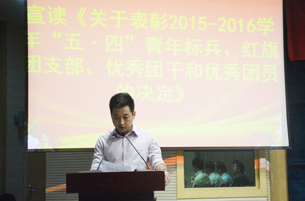 学工部部长陈义文宣读《关于表彰2015—2016学年“五·四”青年标兵、红旗团支部、优秀团干和优秀团员的决定》摄影:阚力彬