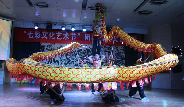物流学院带来的《龙腾九霄》正式拉开晚会的帷幕,舞者们各自手持龙架,有的依靠腿部力量,悬空仰卧在队友半躬的背部,跳转、翻越,动作统一和谐,花样百出,美与力量的完美结合使整个节目别具特色;民族教育学院带来的《土家摆手舞》,展现出了土家族姑娘们的热情和奔放;相声《戏说国学》,表演者一高一矮,一胖一瘦,用十分诙谐的语言戏说《论语》中易错的部分,令现场观众捧腹大笑;校学生会带来的“僵尸舞”《Zombie dance》,表演者甩着手,如同僵尸一般机械地跳着,大胆突破常规,使晚会的气氛上升到高潮。