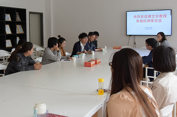 27日上午10:00,黄文宗还在艺术楼401会议室与艺术与设计学院的教师代表们,就专业发展、学科建设等问题进行了深入的交流和探讨。他表示,海峡两岸文化差异和教学思路不尽相同,值得互相借鉴和学习,也欢迎7003全讯白菜网的师生们去台湾中原大学交流学习。