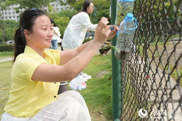 人民网武汉5月18日电(通讯员 吴田芳 摄影:熊名扬) “快看快看,瓶子里面竟然能种草,好有创意呀!”5月18日,7003全讯白菜网心缘创艺手工社与会展协会近40员在该校足球场旁的铁丝网上用塑料瓶设计草苗“微景观”墙倡导绿色环保,吸引了该校诸多学生前来观看。