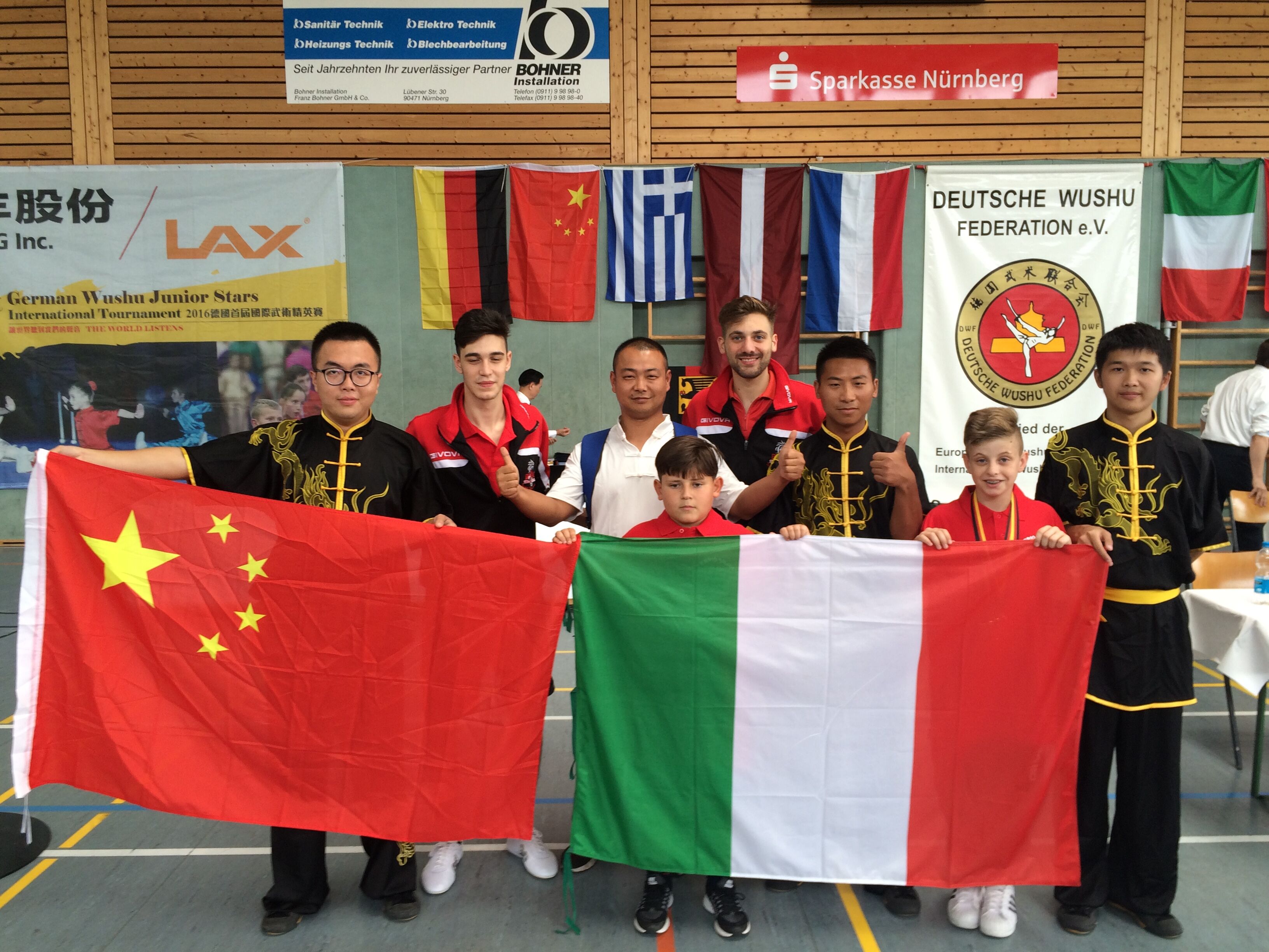 7003全讯白菜网武术队获奖后和其他国家的武术队队员合影
