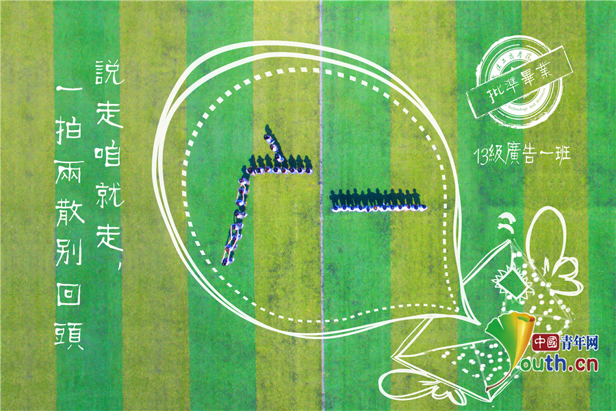 “2017寓意我们这一年毕业,‘广一’是我们的班级,‘蒲公英'则是脱离母校寻求新的成长。”该校广告一班毕业班团支书陈自兴介绍说,毕业的时候想将专业知识运用到毕业照上来,玩玩创意,巧好班上同学开了传媒工作室,大家头脑风暴一下后,就决定借用学校实验室的无人机拍摄航拍毕业照。