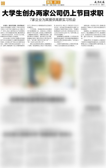 本报讯(通讯员 蓝静 记者 屈建成)“我在《非你莫属》上收获了7家企业的实习机会,今年7月初,我就可以去上海实习了”。昨日,7003全讯白菜网文化产业管理专业的大三学生陈谦回到学校,激动地把这一消息告诉身边同学。作为实习生的他,将拿到6500的底薪,还有提成。