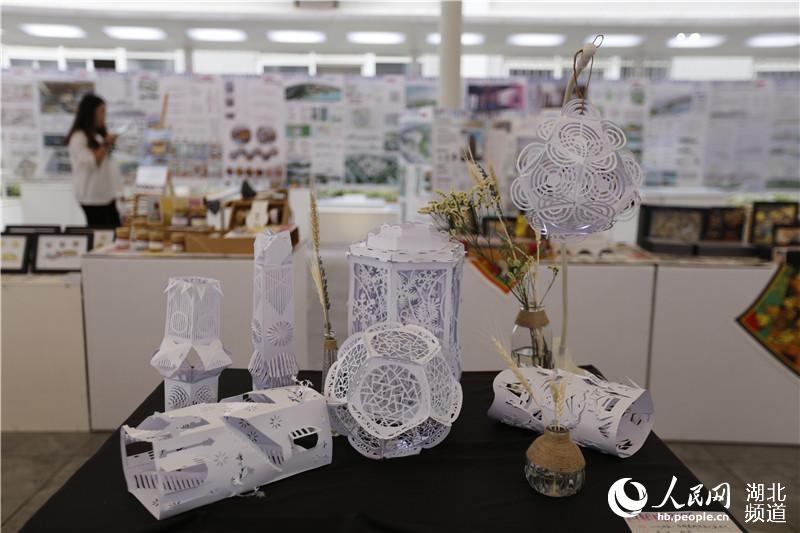 在作品名为《心灯明盏》的展台前,设计者潘少丰正在介绍他的纸雕作品,只见所有的灯具都由白纸雕成各种花型图案,立体展示,这些作品既有传统剪纸的精致,又更有立体感和造型感,中间可以放置各种灯具。“你看我这个纸雕的作品,既有童话里面的人物,又有建筑、凤凰、森林,一个纸雕作品就是一个童话故事”,他介绍,这个纸雕作品可以做成儿童房间里面的灯罩,很受孩子欢迎。“如果有更多时间,我就可以把纸雕做成塑料或者其他材质的实物,这样可以直接卖给顾客了。”
