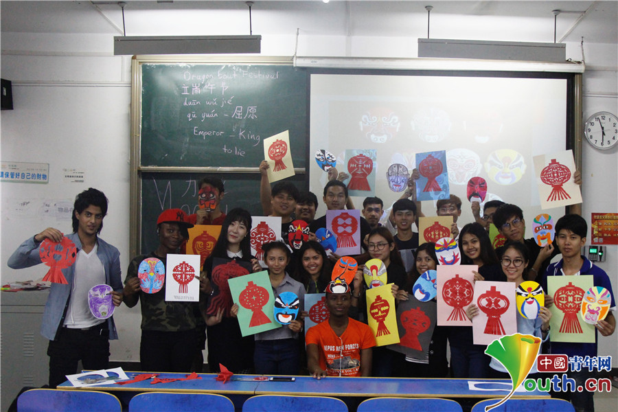 随后,老师在投影仪上播放出京剧脸谱的图样,外国留学生们惊呼“太有趣了!”,画轮廓、填图案、上色,一个小时的课程结束了,学生们仍意犹未尽。Por说,她以后要开个店,就卖中国的剪纸和脸谱。