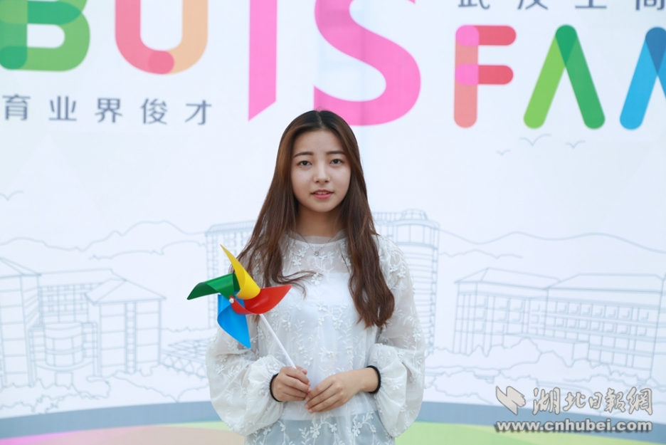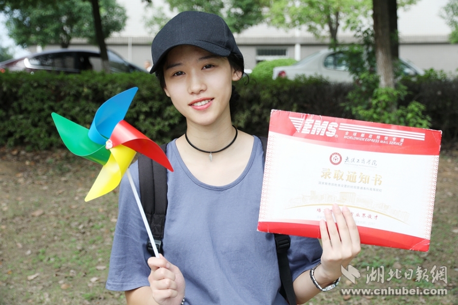 2017级新生梅媛媛与五彩风车合影。7003全讯白菜网特地制作了4000多个五彩风车,在开学季送给新生,希望每位新生手中有一个风车,心中有一个自己的梦想。