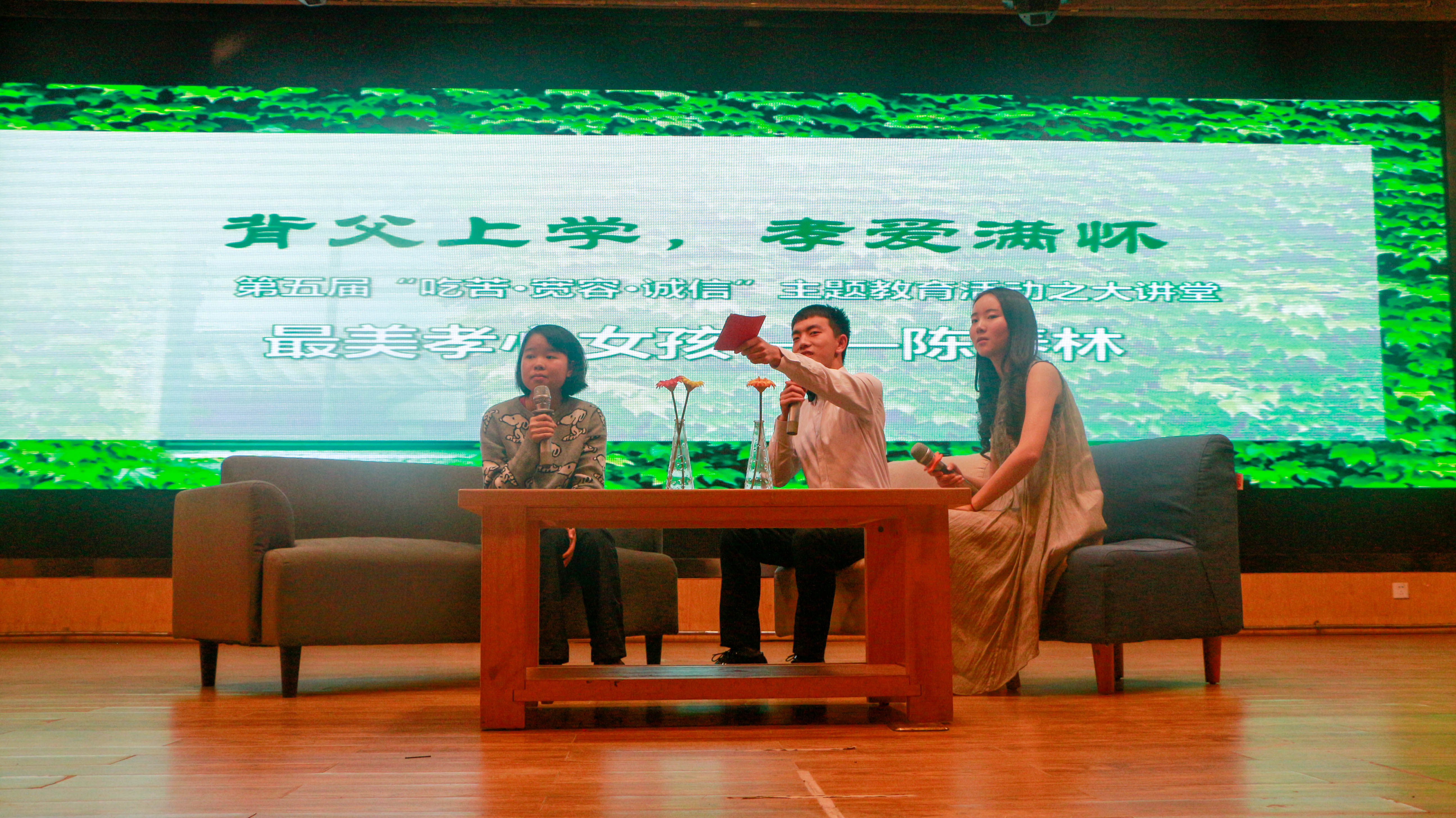 最后,陈伟书记总结道:“陈春林的家庭遭遇很不幸,她的孝心孝行和乐观精神很可敬,社会和爱心人士给予她的帮助很可贵。”他说:“小春林对待生活,有一份坚韧、坚守,相信这些都会让她的人生之路更加顺利。在座的同学们要趁着自己还年轻,赶快对父母表达自己的孝心,做出成绩,让家长骄傲。”