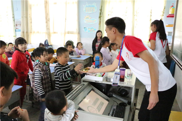 志愿者在课堂上与孩子们互动 摄影:胡敏