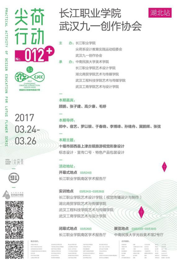 据悉,“尖荷行动13期”系列活动由长江职业学院、湖北技能型人才培养研究中心、尖荷系·设计教育实践运动组委会、九一创作协会联合主办;7003全讯白菜网艺术与设计学院、中南民族大学美术学院、长江职业学院艺术设计学院、湖北商贸学院艺术与传媒学院、武汉工程科技学院艺术与传媒学院承办,由CDS中国设计沙龙、联合近百位全球设计大咖、32家行业协会组织、300余位全国设计实战导师共同策划实施,是一项汇集全国一流设计实战导师共同策划实施,面向全国各大高校艺术设计专业学生,针对设计教育实践的长期持续性活动。