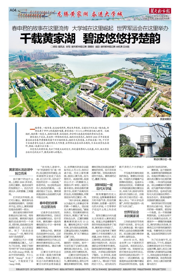 黄家湖之于武汉,是这样一种特殊的存在:她的历史很悠久,相传和2000多年前楚国著名政治家春申君黄歇有着千丝万缕的联系;她的今天很青春,大学城坐落一侧,十万学子在她身旁矢志成才;她的明天无可限量,世界军运会在汉举办期间,万名运动员住在湖畔,跟她一起看日出日落……