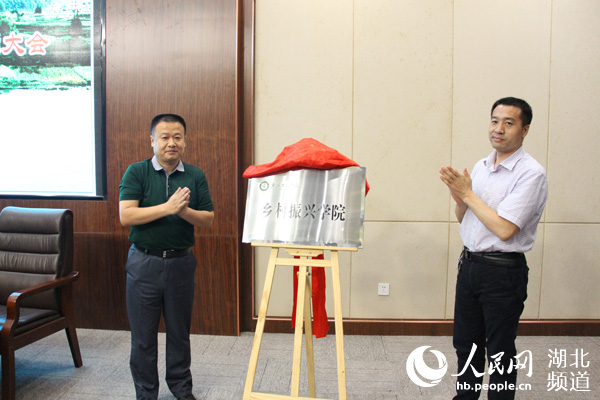 湖北省委农办调研员陈立刚、省教育厅发规处副处长邢林春为乡村振兴学院揭牌 摄影:唐明悦