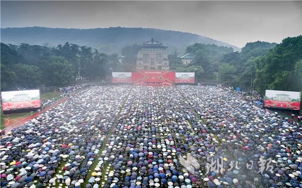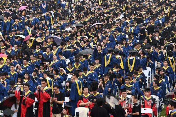 6月22日,武汉大学毕业典礼现场。当天,武汉大学2018年毕业典礼在雨中如期举行,1万余名武大毕业生身着学位服坐满整个操场,81位豪华导师团成员为毕业生一一拨穗授学位,为毕业生们送上美好祝福,学校还为每位在场毕业生拍摄一张与拨穗导师的珍贵合影。