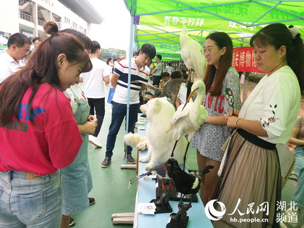 在华中农业大学博物馆科普宣传展位上,展示出的孔雀、白狐、七彩文鸟等各类动物标本栩栩如生,该馆的志愿者、华中农业大学动物科学专业大四学生曹野向参观的市民、大学生们介绍了这些动物标本的制作过程和其中运用到的医学技术。
