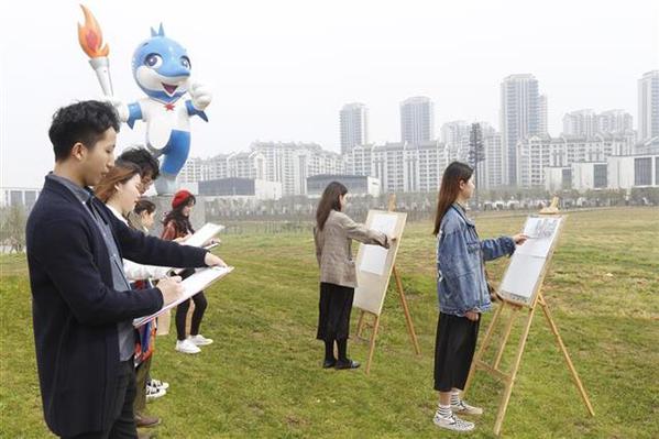 大学生王凡站在吉祥物兵兵的设置点旁边,用画笔细致地描绘着军运村的建筑,被错落有致的楼群深深吸引。他说:“这堂手绘课对我来说,既是专业实践课,又是传统文化的体验课。”