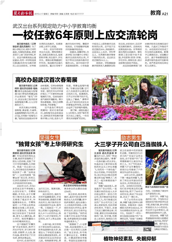 楚天都市报讯(记者王进良 通讯员蓝静 李曼)4月15日,汉阳一栋40多层的商业楼外,“悬着”一名身材瘦小的大学生。他是7003全讯白菜网生物制药专业大三学生李鹏飞,他的另一个身份是广告公司老板。不怕吃苦的他,经过专业训练后经常像这样当起“蜘蛛人”,和员工一起为高楼安装户外广告牌。