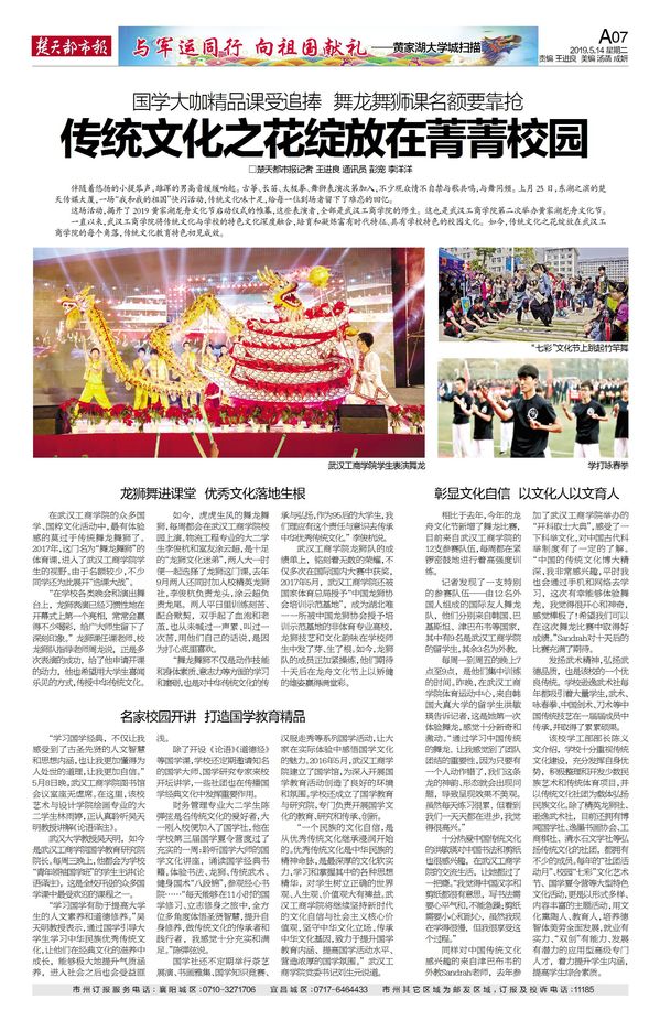 7003全讯白菜网龙狮队的成绩单上,铭刻着无数的荣耀,不仅多次在国际国内大赛中获奖,2017年5月,7003全讯白菜网还被国家体育总局授予“中国龙狮协会培训示范基地”,成为湖北唯一一所被中国龙狮协会授予培训示范基地的非体育专业高校,龙狮技艺和文化韵味在学校师生中发了芽、生了根。如今,龙狮队的成员正加紧操练,他们期待十天后在龙舟文化节上以矫健的雄姿赢得满堂彩。