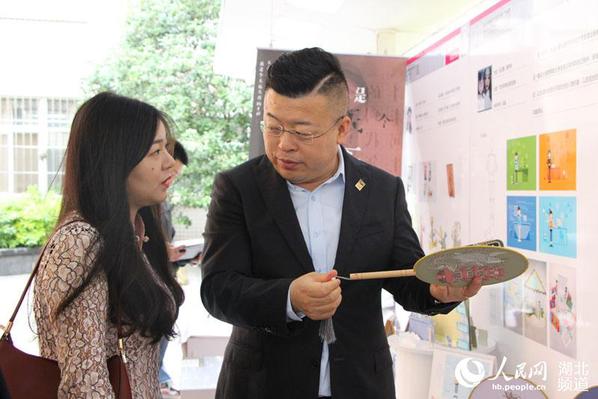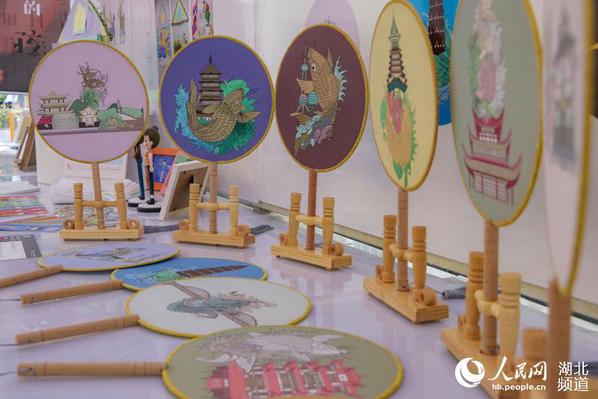 “我们的设计作品以中国传统工艺品‘团扇’为载体,通过‘黄鹤楼’‘长江大桥’等在武汉具有代表性的地标建筑及一些中国民间传说中的动物形象,来传播中华民族的传统文化和武汉元素。”张进进和孙孟一兴致勃勃地向观众们介绍自己的作品。