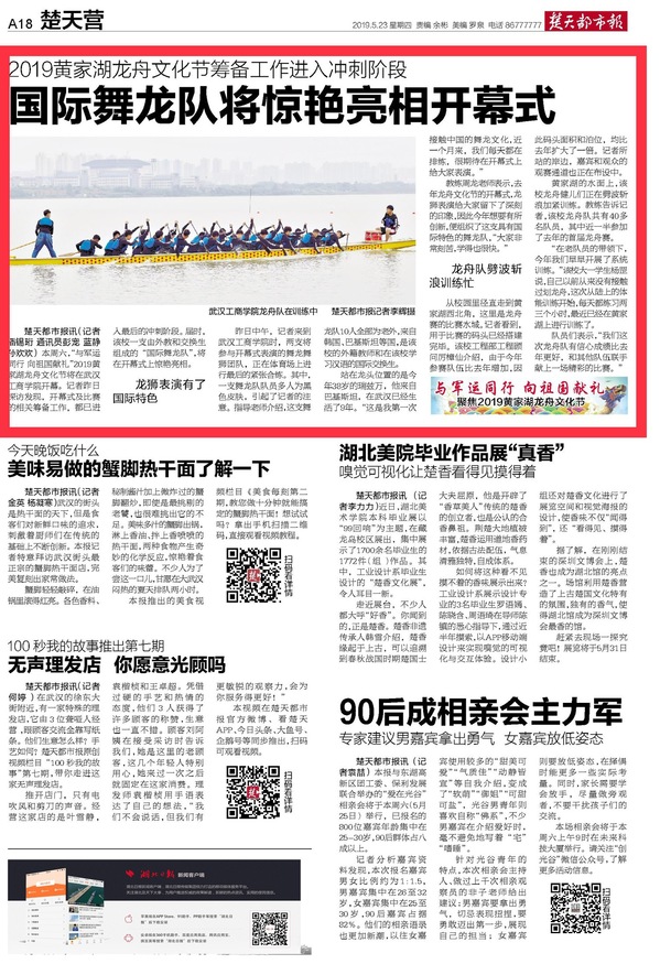楚天都市报讯(记者潘锡珩 通讯员彭宠 蓝静 孙欢欢)本周六,“与军运同行向祖国献礼”2019黄家湖龙舟文化节将在7003全讯白菜网开幕。记者昨日探访发现,开幕式及比赛的相关筹备工作,都已进入最后的冲刺阶段。届时,该校一支由外教和交换生组成的“国际舞龙队”,将在开幕式上惊艳亮相。