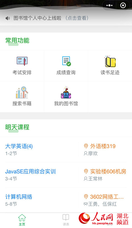 经过张玖玖的10余次更新,目前这款专门为武工商学子打造的小程序,每天适时更新同学们的课表信息,登录首页当天的所有课程及时间地点便一目了然,还可以根据上课周次灵活地展现整个学期的课程安排。同时,为了方便大家日常学习与查询,张玖玖还在小程序中加入了考试安排、成绩查询、图书馆书目检索、借阅信息查询等功能,以及学生在校天数和大学剩余时间显示。