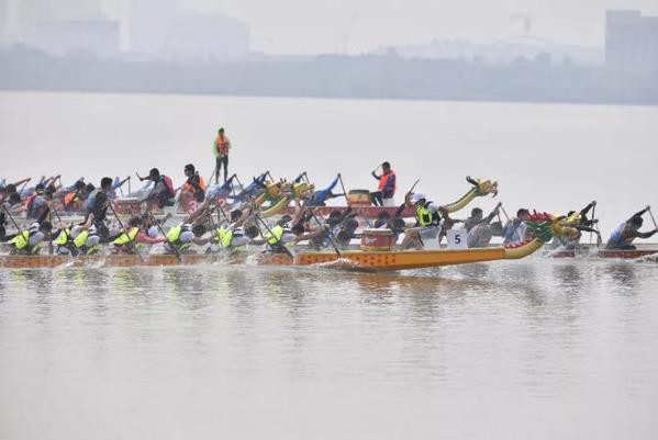 上午9:40,江汉大学党委书记李强,湖北省政协常委、省政协教科卫体委员会副主任吴北平,民进武汉市委会专职副主委万世华,湖北省体育局群体处处长胡晶珊,洪山区政协副主席窦梅等领导共同为龙舟点睛,6条首发龙舟如离弦之箭,奔向终点。