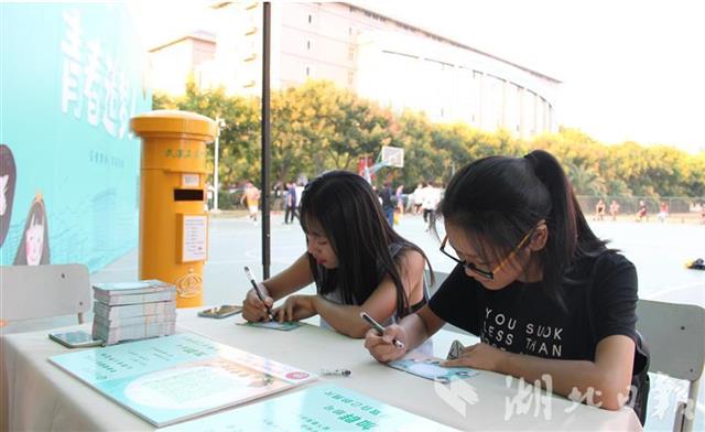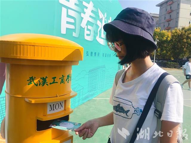 新生们纷纷把青春的梦想与期盼写在明信片上,并投入“未来站”邮筒里,希望明信片穿越时光“寄”给毕业时的自己。