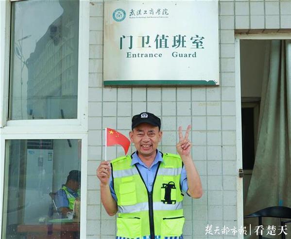 门卫师傅与国旗合影 摄影:黄娟