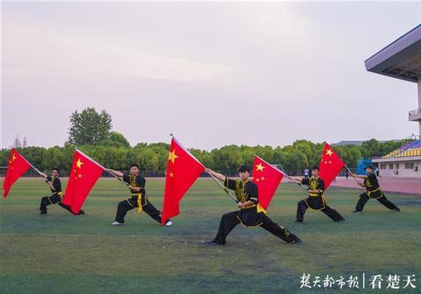 学校武术队队员与国旗合影 摄影:谭艳
