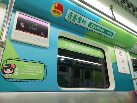 9月30日,“鄂爱你,中国”——庆祝新中国成立70周年“青春湖北”号地铁专列在湖北武汉正式发车。该列车共设置6节车厢,分别以“理想、爱国、担当、奋斗、本领、品德”为主题,展示了湖北青年紧跟党的步伐、传承红色基因、坚定理想信念、勇立时代潮头的青春风采。专列车厢内部,蓝绿搭配的装饰色调让人倍感活力,墙面上用青年人喜欢的“湖小青”卡通人物,展现了少先队、青媒小厨、青创工程、希望工程、志愿服务等品牌形象。“青春湖北”号地铁专列于9月30日至11月7日在武汉地铁二号线上运行。