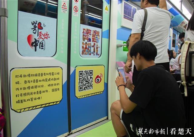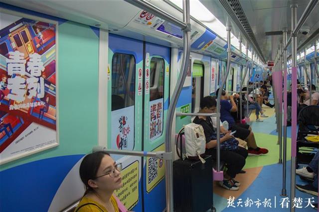 在武汉就读大二的汤宝庚同学一踏上这趟地铁,就觉得眼前一亮,车门上的“青春湖北”四个字吸引了他的注意:“这四个字色彩活泼,充满青春活力,还融合了许多湖北的标志性元素,创意十足!”他说在新中国成立70周年之际,看着车厢内贴着的“青春向祖国告白”“青春向党,奋斗祖国”等标语,感觉更是意义非凡。