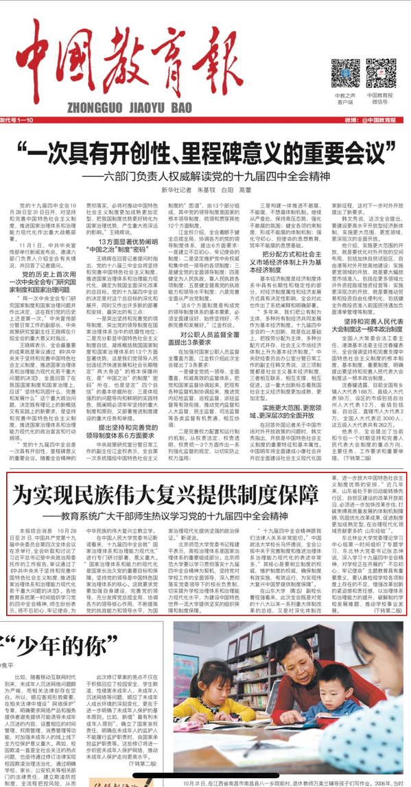 本报综合消息 10月28日至31日,中国共产党第十九届中央委员会第四次全体会议在京举行,全会听取和讨论了习近平总书记受中央政治局委托作的工作报告,审议通过了《中共中央关于坚持和完善中国特色社会主义制度、推进国家治理体系和治理能力现代化若干重大问题的决定》。各地教育系统第一时间组织学习党的四中全会精神,师生纷纷表示,将不忘初心、牢记使命,为中华民族的伟大复兴立教立学。