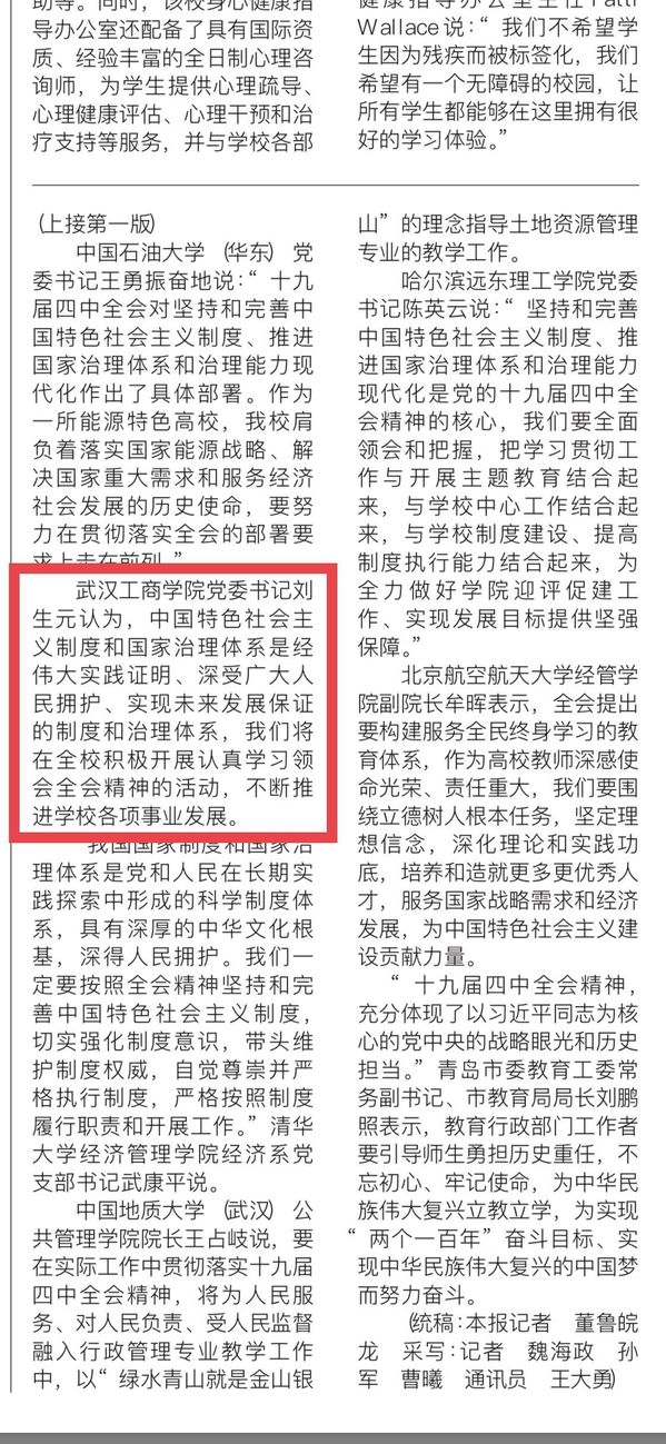 中国石油大学(华东)党委书记王勇振奋地说:“十九届四中全会对坚持和完善中国特色社会主义制度、推进国家治理体系和治理能力现代化作出了具体部署。作为一所能源特色高校,我校肩负着落实国家能源战略、解决国家重大需求和服务经济社会发展的历史使命,要努力在贯彻落实全会的部署要求上走在前列。”