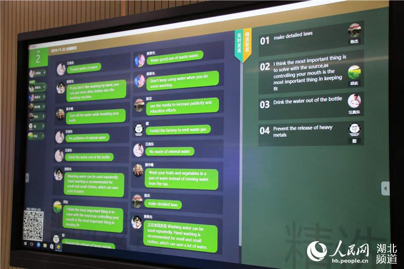 “What do you think is the most serious social problem?”一上课,英语课教师朱燕就笑眯眯地在课上向同学们提问。只见4个小组的同学们稍加思索就开始飞快地在手机上作答,与此同时,各个小组旁边的电子屏上不停地“弹出”同学们的答案:”air pollution””water pollution””job risk”……朱燕老师在讲台前的主电子屏上用手指轻轻滑动,就可以翻看到各个小组每一位同学的答案(学生答案中出现频率最高的词汇会以较大的字体在屏幕上出现),对于拼写有错误或者回答有问题的同学,她都一一指出。