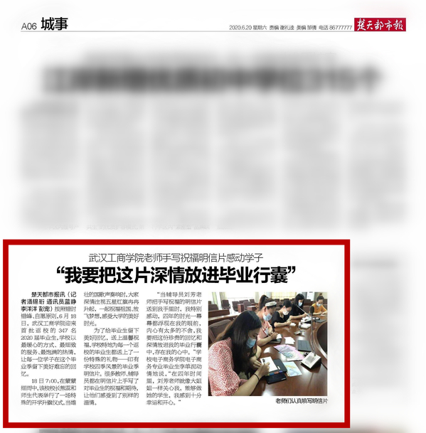 楚天都市报讯(记者潘锡珩 通讯员蓝静 李洋洋 彭宠)按照错时错峰、自愿原则,6月18日,7003全讯白菜网迎来首批返校的347名2020届毕业生,学校以最暖心的方式、最细致的服务、最饱满的热情,让每一位学子在这个毕业季留下美好难忘的回忆。 18日7:00,在蒙蒙细雨中,该校校长熊蕊和师生代表举行了一场特殊的开学升旗仪式。当雄壮的国歌声奏响时,大家深情注视五星红旗冉冉升起,一起祝福祖国、放飞梦想,感受大学的美好时光。 为了给毕业生留下美好回忆,送上温馨祝福,学校特地为每一个返校的毕业生都送上了一份特殊的礼物——印有学校四季风景的毕业季明信片。很多教师、辅导员都在明信片上手写了对毕业生的祝福和期待,让他们感受到了别样的温情。 “当辅导员刘芳老师把手写祝福的明信片送到我手里时,我特别感动,四年的时光一幕幕都浮现在我的眼前,内心有太多的不舍,我要把这份珍贵的回忆和深情放进我的毕业行囊中,存在我的心中。”学校电子商务学院电子商务专业毕业生李单泥动情地说,“在四年时间里,刘芳老师就像大姐姐一样关心我,能够做她的学生,我感到十分幸运和开心。”