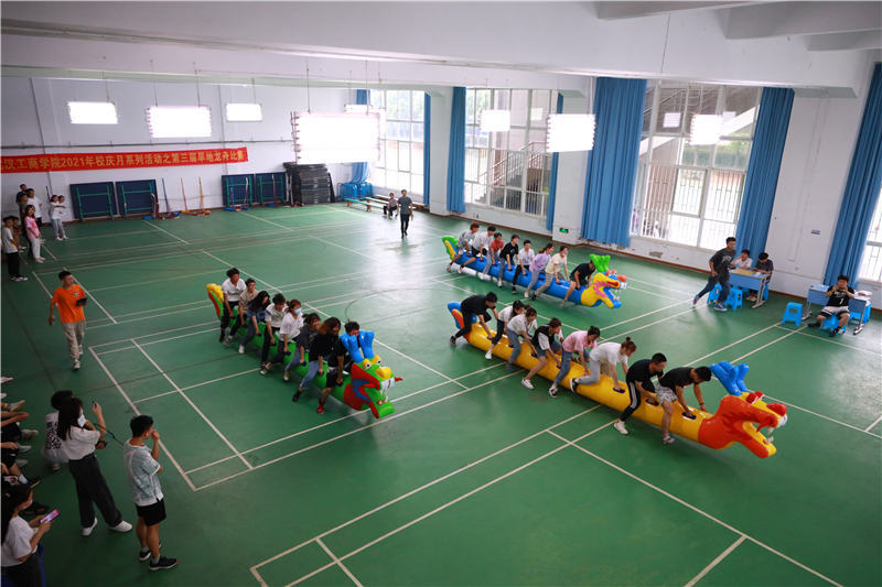 在旱地龙舟赛的赛场上,随着号令的响起,来自各学院的8支代表队如弓箭离弦般向前冲出去,队员们团结默契、行动敏捷,在欢笑声、加油声中奔向终点。