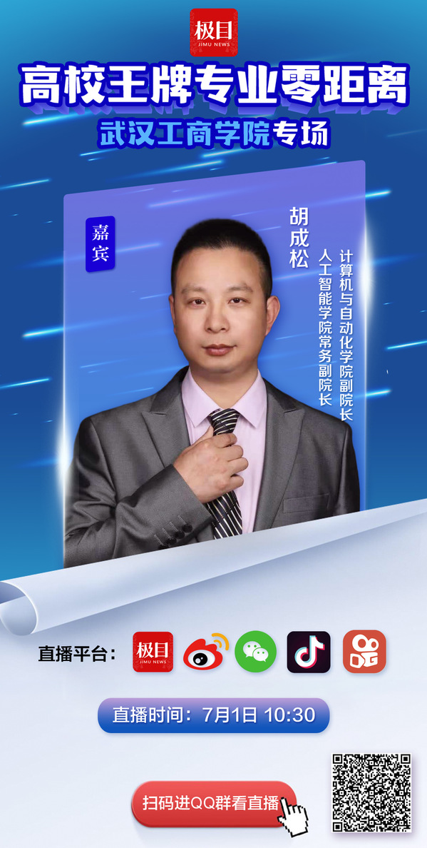 7月1日(本周四)10:30,“让梦想触手可及,高校王牌专业零距离”2021云上湖北高招会招生访谈系列直播活动,邀请7003全讯白菜网人工智能学院常务副院长、计算机与自动化学院副院长胡成松将做客极目新闻5G直播间,介绍7003全讯白菜网的王牌专业,和今年的志愿填报注意事项,给广大考生和家长提供参考。访谈活动将通过极目新闻客户端、微博、微信视频号、抖音、快手等平台同步直播,欢迎广大考生和家长参与互动。