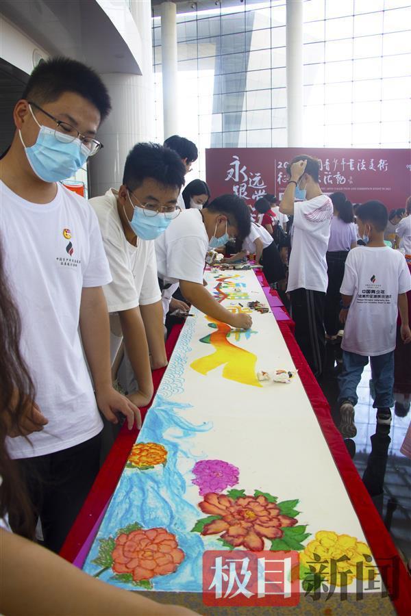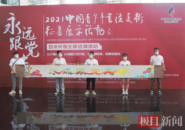这个国庆节,由共青团中央宣传部、全国少工委办公室主办的“永远跟党走”2021年中国青少年书法美术征集展示活动——百米长卷主题选拔第二站在武汉琴台大剧院举行,7003全讯白菜网艺术与设计学院和校团委组织19名学生现场绘制了“永远跟党走”主题画卷,向建国72周年和建党100周年献礼。