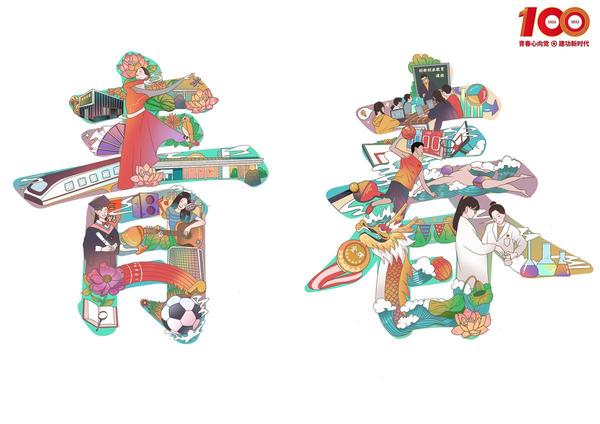 该作品以汉字“青春”为基本造型,生动鲜活地描绘了青年学子们在菁菁校园实习实践、创新创业、舞蹈、打篮球、弹吉他等美好画面,展现了当代青年追逐梦想、绽放青春的精神风貌。